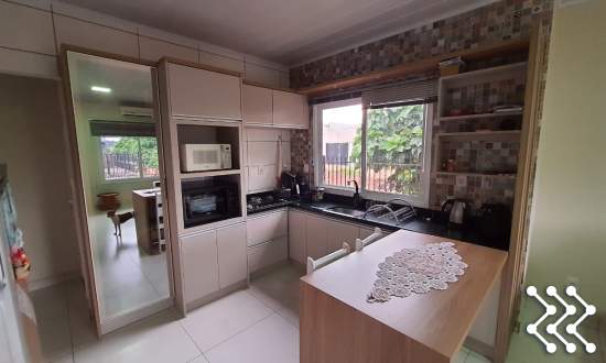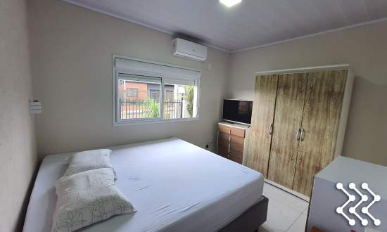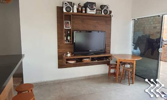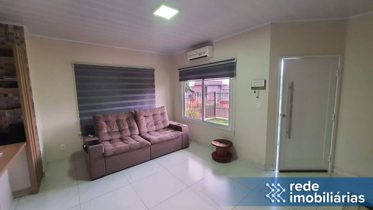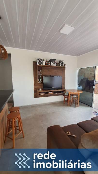 A casa oferece sala e cozinha mobiliada integradas, proporcionando espaços amplos e funcionais.
