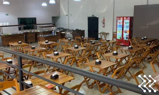 O restaurante está em pleno funcionamento, completo com mesas, cadeiras, buffet