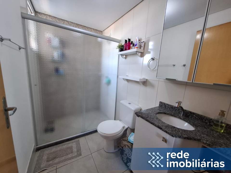 Banheiro com box de vidro, acabamento clean e moderno.