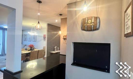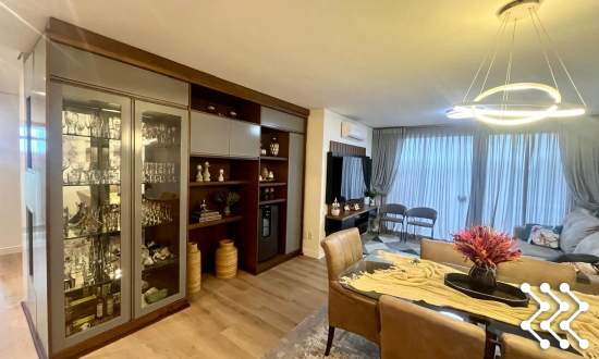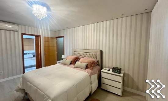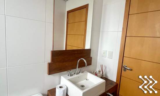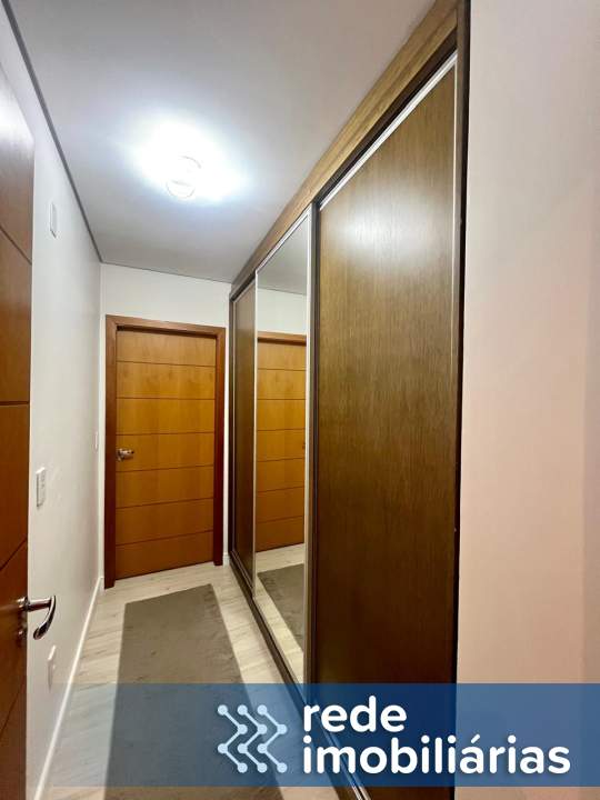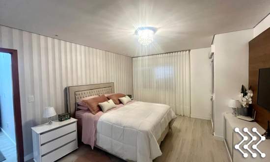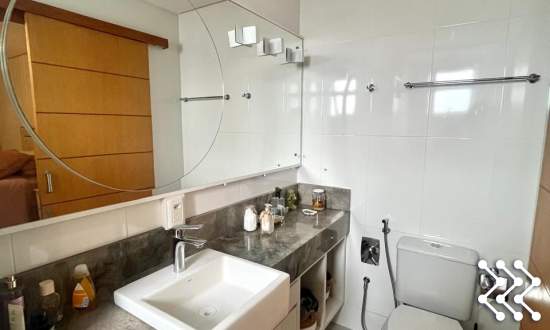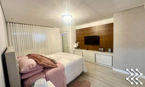 Suíte com sacada, móvel de TV, roupeiro, luminárias, banheiro com móvel