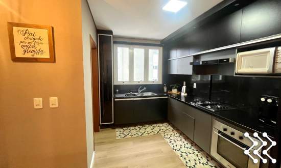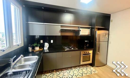 Cozinha mobiliada - com churrasqueira rotativa, bancada em granito e móveis sob medida - com fogão cooktop, torneiras com misturador;