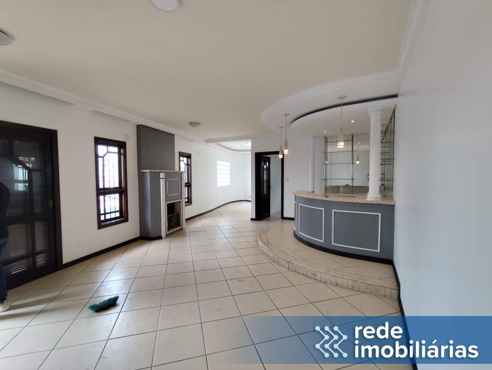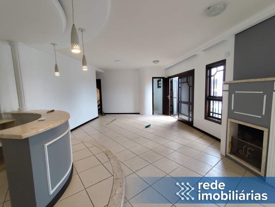 Sala ampla com lareira, bem iluminada e ventilada