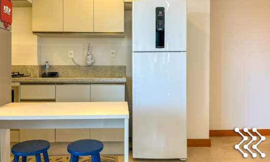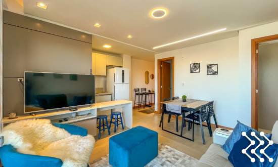Sala aconchegante, integrada a cozinha totalmente equipada.