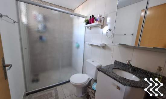 Banheiro com box de vidro, acabamento clean e moderno.