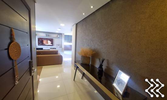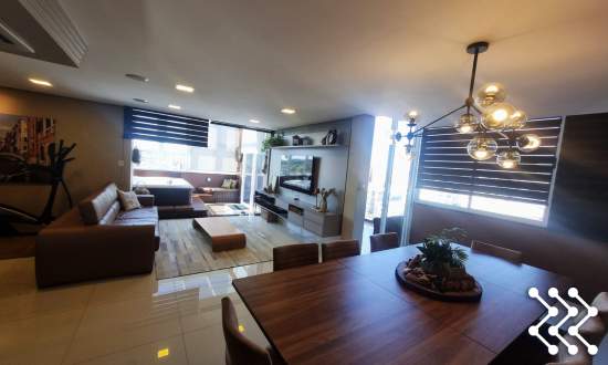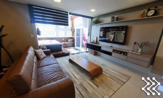 Um dos grandes diferenciais é a hidromassagem integrada à sala, com vista panorâmica, criando um ambiente único de relaxamento e contemplação. A sacada/varanda é ampla, proporcionando ainda mais integração e luminosidade aos ambientes.