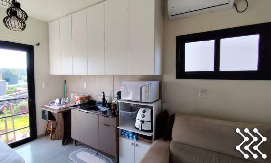 Dormitório e cozinha com móveis planejados