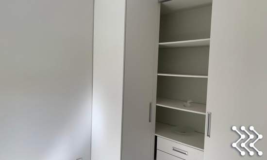 Cozinha, possui balcão com pia, e um dos quartos um roupeiro sob medida.